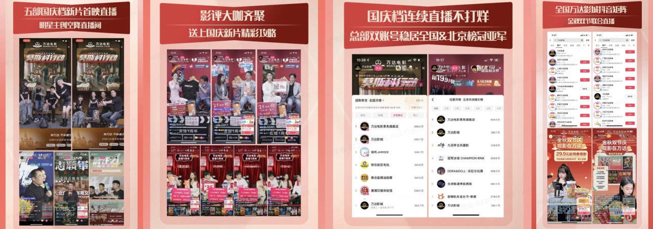 要想持续扩大活动声量,就必须要有和期望相匹配的发声规模。“单丝不成线、独木不成林”,万达电影启用30个区域的万达影城平台矩阵号,于9.29至10.8进行了为期10天的连续直播。金秋双节正是平台用户观影高峰,在「抖音国庆吃喝玩乐节」节点大促、专属货品补贴等资源加持下,直播间热度居高不下,总部双账号稳居全国榜的冠亚军。