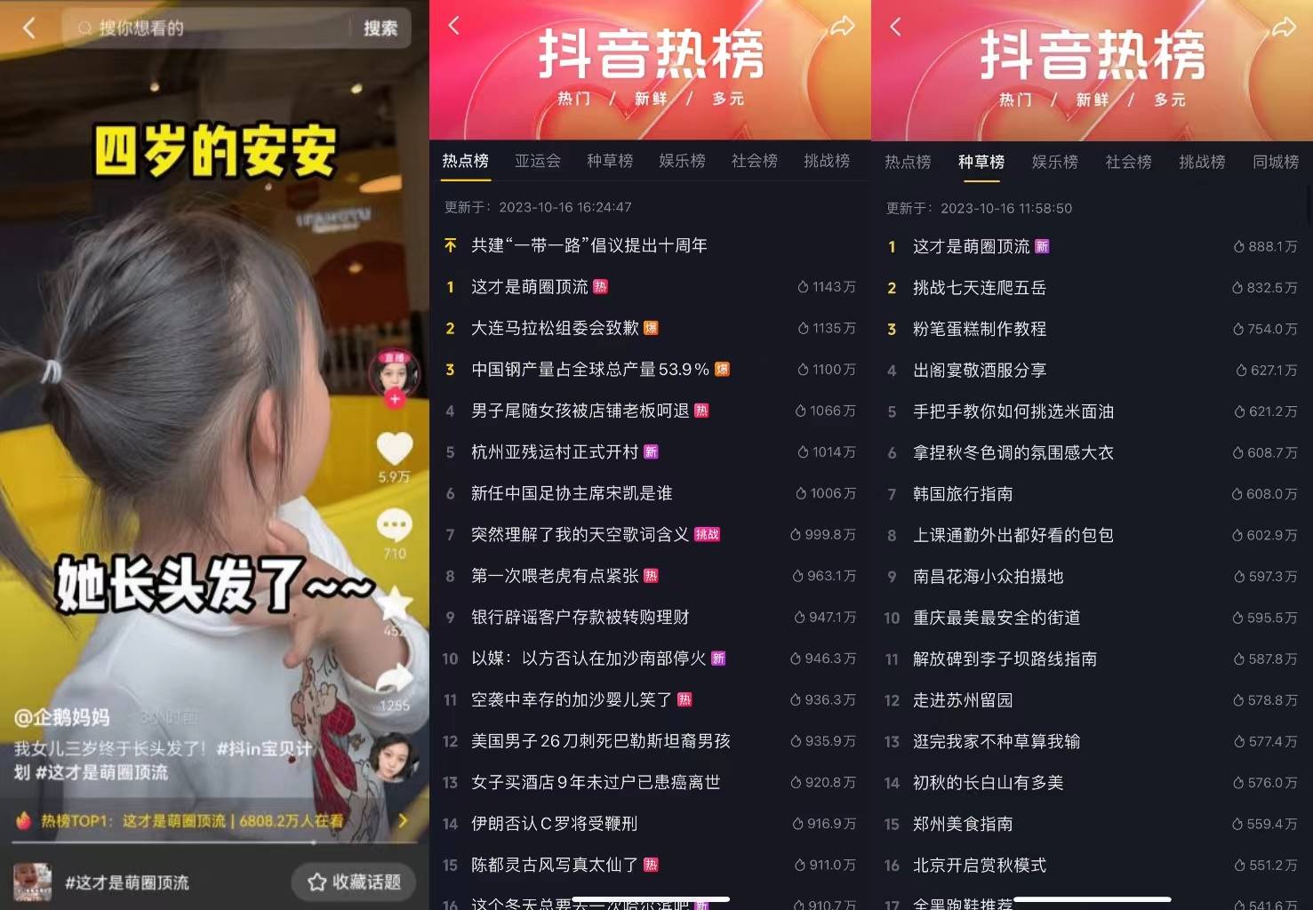 同时,抖音电商洞悉用户情绪和站内氛围前置策划热点话题,邀请各圈层达人发布“萌娃”或“萌宠”趣味视频,一经发布迅速引发全网热议,在站内掀起“萌圈顶流争霸”风潮,#这才是萌圈顶流 话题热度持续飙升,视频播放量超千万,登上抖音热点榜TOP1 、种草榜TOP1。各圈层达人们分享自己的萌娃萌宠、晒出与萌娃萌宠相处日常,与网友探讨育儿经...同时通过发布日常“萌”瞬间、好物种草、优质新品推荐等视频内容为活动造势,有效聚拢公域流量,辐射更多受众,吸引用户参与话题互动,助推活动出圈。同时将本次活动营销信息和品牌新品植入其中,为品牌商家带来更好的传播效力和流量支持。