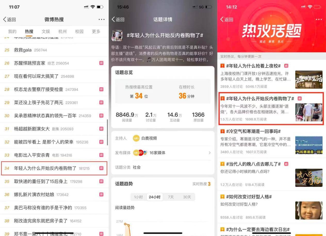 在红包人线下发福利带动“真补贴”认知出圈后,抖音着手承接这一网友自发的话题热度。为了更好的了解用户需求,抖音结合对年轻人“反内卷”的心理状态洞察,发起了#年轻人为什么开始反内卷购物了#的社会向话题,凭着超高的话题共鸣,登上微博热搜总榜Top 24以及微博热议榜Top 2位置;且该话题更是在热议榜中长达2日。