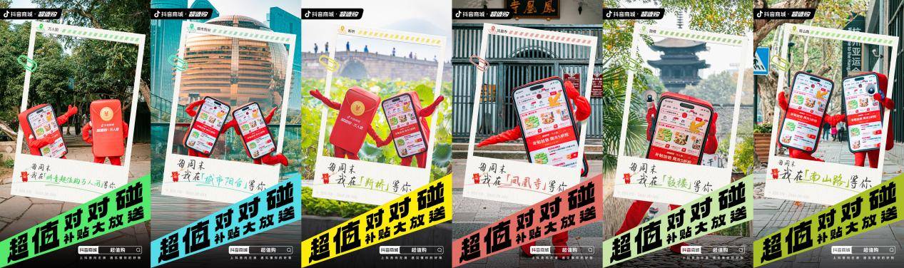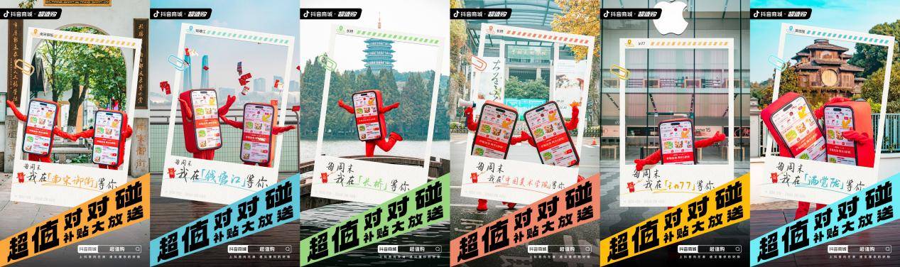 此外,“红包人”还闪现满觉陇、南宋御街、鼓楼等杭州各大地标性建筑,萌趣的拟人化打卡照强化了“真补贴”的平台印象。在各大平台商战打的火热之时,抖音却选择默默为消费者送福利,这一看似“反效率”的做法,却真实戳中了大家的心窝。由此大批用户自发讨论并推动话题发酵,带动热度攀升,让抖音超值购万人团“真补贴”的平台利益点得以更广泛的传播。