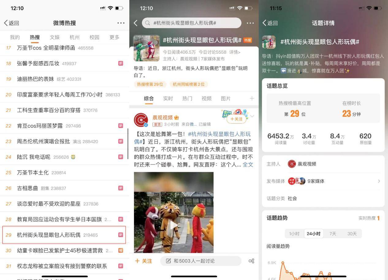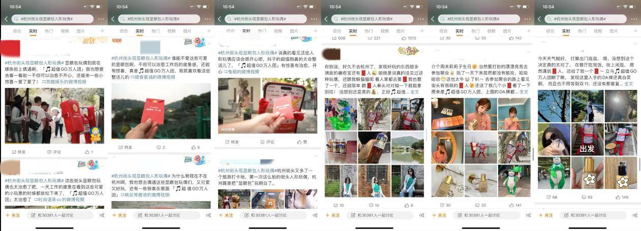 10月30日,在“顶流”节日万圣节还留有余温之时,各式装扮人偶在杭州街头出没,其中最吸睛的莫过于抖音超值购万人团的“红包人”。因为其“显眼包”特性,加之派发红包福利俘获人心引围观,路人偶遇后纷纷于各大社媒平台发布“红包人”路透图,一时间#杭州街头现显眼包人形玩偶#冲上微博热搜总榜TOP 29;微博同城热搜榜TOP 2;更有微博、小红书达人偶遇后分享视频,进一步为万人团再添热度。