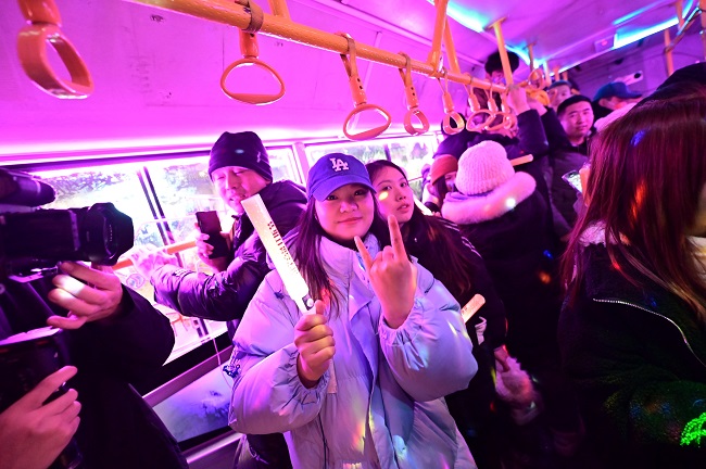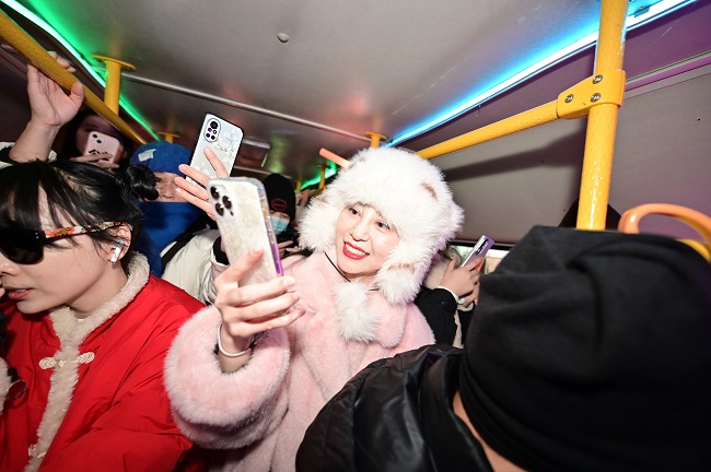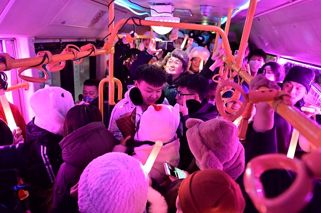 随着车辆一路前行,坐在车上的每一个人,无论是南方来的小土豆还是对于蹦迪公交早就游刃有余的本地人,都在这支洗脑神曲的伴奏下,体验着一种独特的快乐。他们在这个特别的夜晚,把烦恼和寒冷甩掉,一起释放自己的情绪。