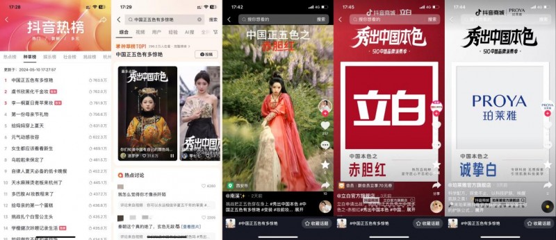 除央视网TVC外,关于“中国正五色”的话题讨论还激起了商家、达人的共创热情。活动期间,#中国正五色有多惊艳 的话题吸引了各行各业尤其是美妆日化商家达人的广泛参与,成功助推该话题冲上抖音种草榜TOP1。达人纷纷穿戴不同朝代传统服装,开启“挑战用正五色秀出中国本色”换装,秀出中国服饰色彩之美;手工艺人穿针引线,用色彩艳丽的丝线,绣出栩栩如生的动物绣品;各大品牌也玩起颜色梗,将传统正五色代表的符号含义,进行了崭新的品牌价值演绎。