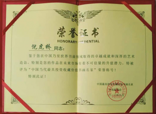 倪虎桥,字铭乔。生于上海,上海市人,祖移杭州余杭人氏,毕业于上海工业高生等专科学校美术系。世界教科文卫专家组成员,全国文明杯写字段位大赛评为:上海民族画院高级画师,中国书画函授大学研究会员,旅美画家。全日中第十九回金奖得主,现任精英会名人财富书画院副院长,中国书画家协会名誉主席,中国当代著名书画家,民间口碑:国宝、荷花、理论家、教授等,膜拜大德高僧宣化上人,多次参加扶贫帮困和慈善事业的献爱心公道活动,被授予模范艺术家荣誉称号。