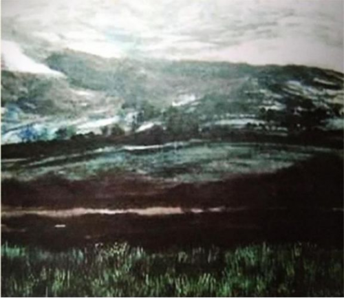 库车:远处油田外,薄雾云霞,绿树间有散落的民居