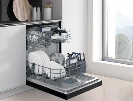 洗碗机内部轻巧灵动的餐具篮设计,可以根据使用者的需求进行移动,适配度更高。上层抽屉的可伸缩设计,让它得以在凭借更小的体积容纳更多的餐具的同时,释放出更多垂直空间,让下层的餐具摆放更灵活。