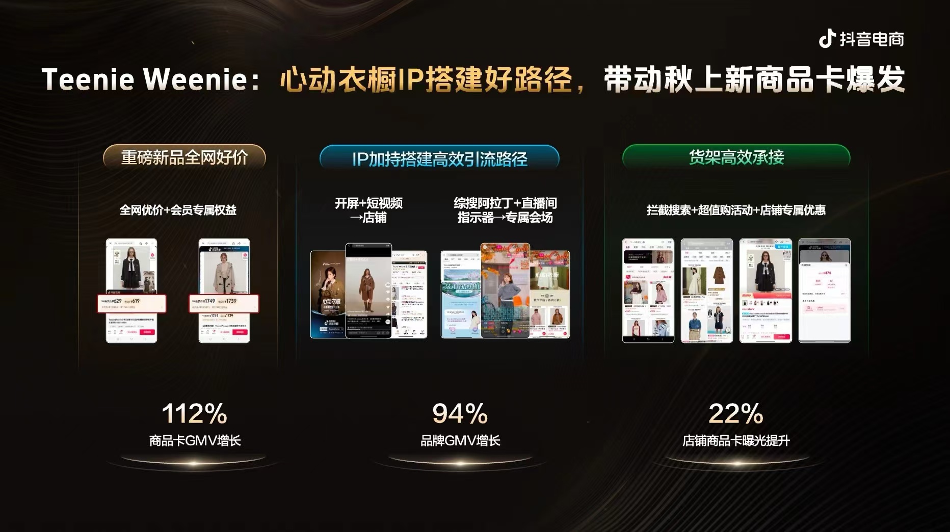「心动衣橱」IP,正是抖音商商城平台对“信号输入”和“路径缩短”的进一步发力,旨在帮商家构建起一条从内容场景直达商品卡的流畅导购路径,为生意增长注入更多确定性。Teenie Weenie就是在这一IP加持下,搭建起了高效引流路径,并设置拦截搜索+超值购活动+店铺专属优惠,达成货架高效承接,最终品牌GMV增长94%,店铺商品卡曝光提升22%。