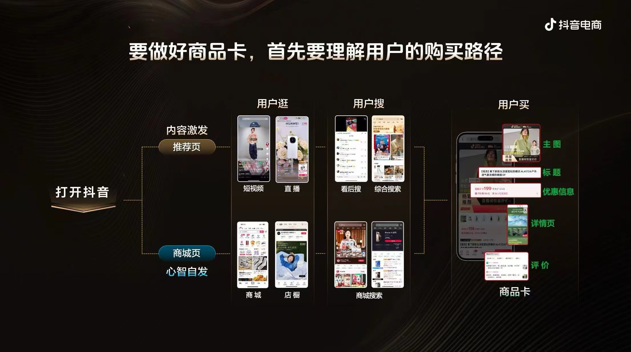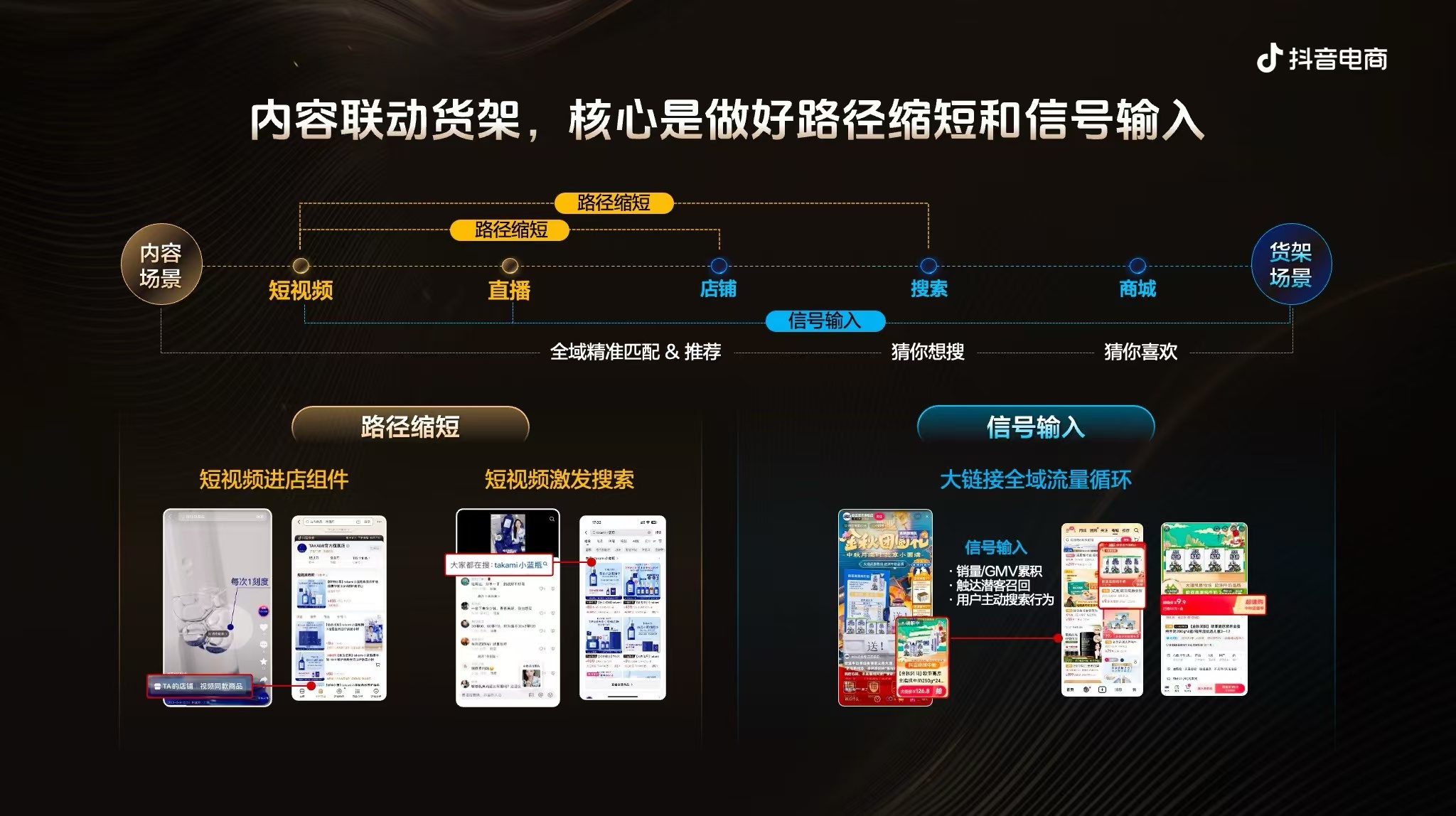 而对于相对成熟的商家,抖音商城更倾向于引导他们做好内容场和货架场的联动,并提供了更为高阶的增长加速秘籍:以“信号输入”和“路径缩短”为核心,沿货盘上新、内容驱动、营销放大的路径,实现商品卡的爆发。商家可以借助全域精准匹配&推荐体系抓住更多流量,同时利用短视频进店组件、短视频激发搜索等缩短种收链路。