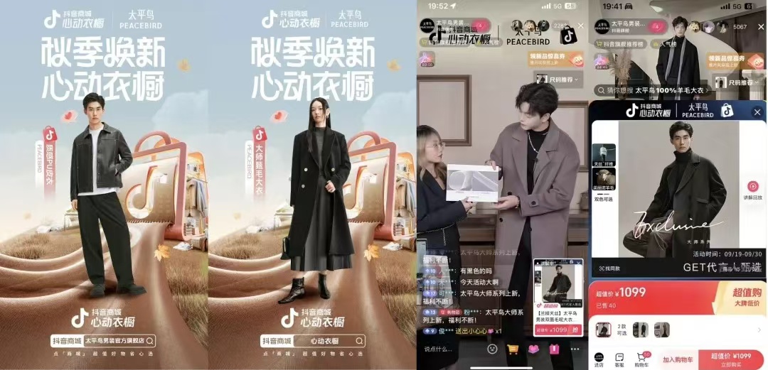 棉致已然树立起了一个经典范例。太平鸟则是在它的基础上,增加了更多线上线下联动,通过明星艺人实现无缝衔接,最终推高线上货架场景的生意。太平鸟打造「甄质·新生」campaign期间,与时尚媒体GQ合作,线下落地甄质工坊,展现品牌成衣品质升级过程,同时邀请付辛博、娜然两位明星到访甄质工坊,联动代言人王鹤棣拍摄的太平鸟品质系列大衣LOOK,同时抓住众多达人直播间的流量溢出,通过商品卡进行流量承接,最终在活动期间登上男装当日榜Top 1。