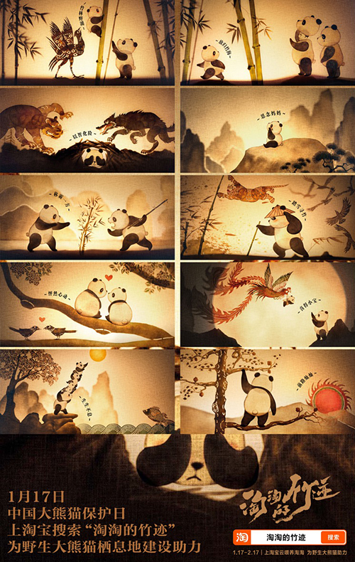 1月17日,皮影戏微电影《淘淘的竹迹》上线后全网讨论度飙升,淘宝以国潮时尚创意方式,演绎了一只名叫淘淘的熊猫,被放归竹海后13年经历的精彩片段,从熊猫妈妈和饲养员“竹林野训”,到惊心动魄的“以智化险”“踏雪寻竹”,与大熊猫华妍的“怦然心动”,喜得小宝的暖心场景……