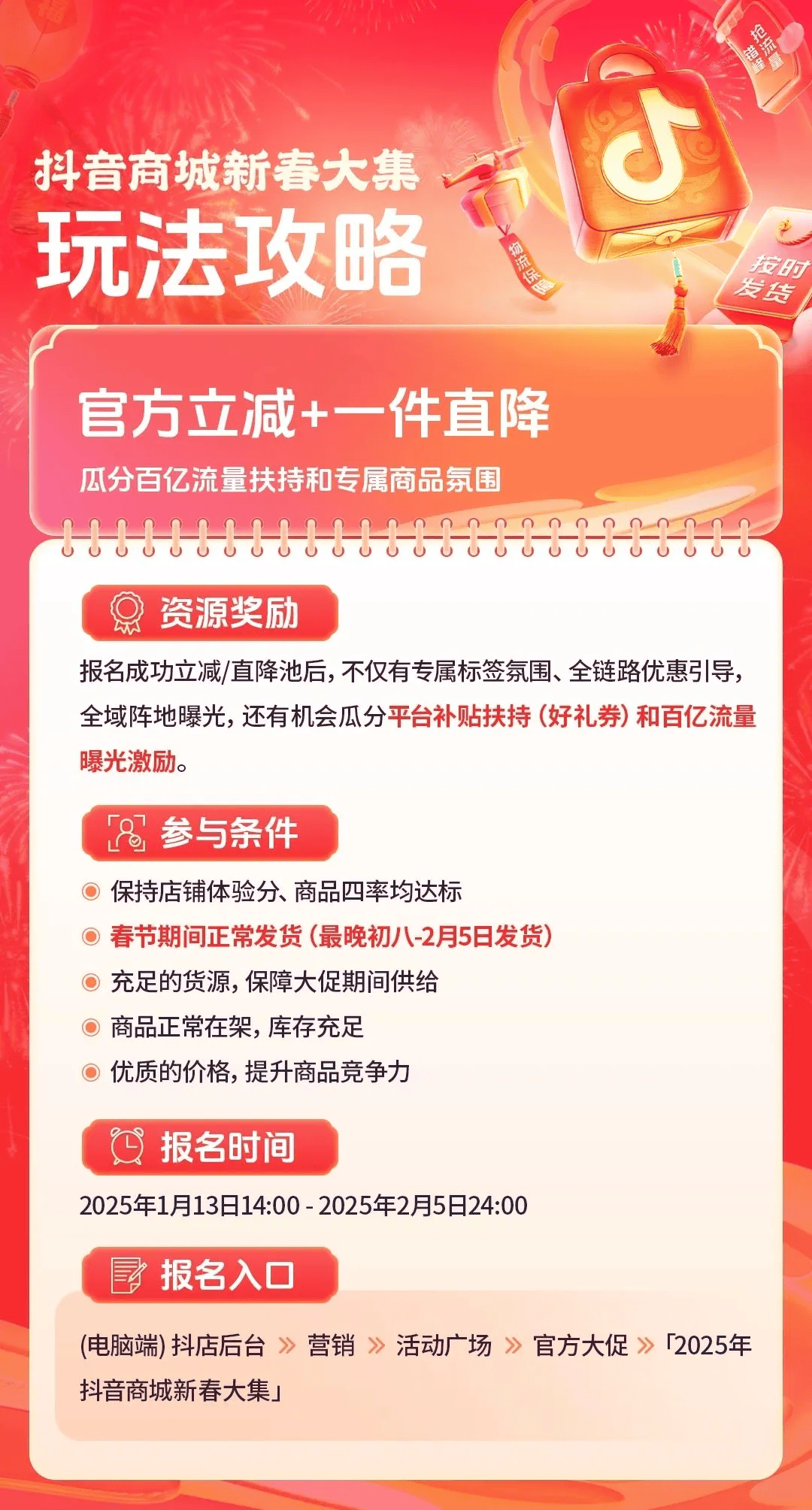 这两大玩法通过优惠补贴,帮助商家提升商品价格竞争力,让大促玩法更简单、参与门槛更低,进一步扩宽商家生意规模;同时,抖音电商也给予了报名成功的商家全链路优惠引导的专属标签,以及平台好礼券的加码扶持,让其有机会分享百亿流量激励,全力保障商家春节营销活动的顺利开展。