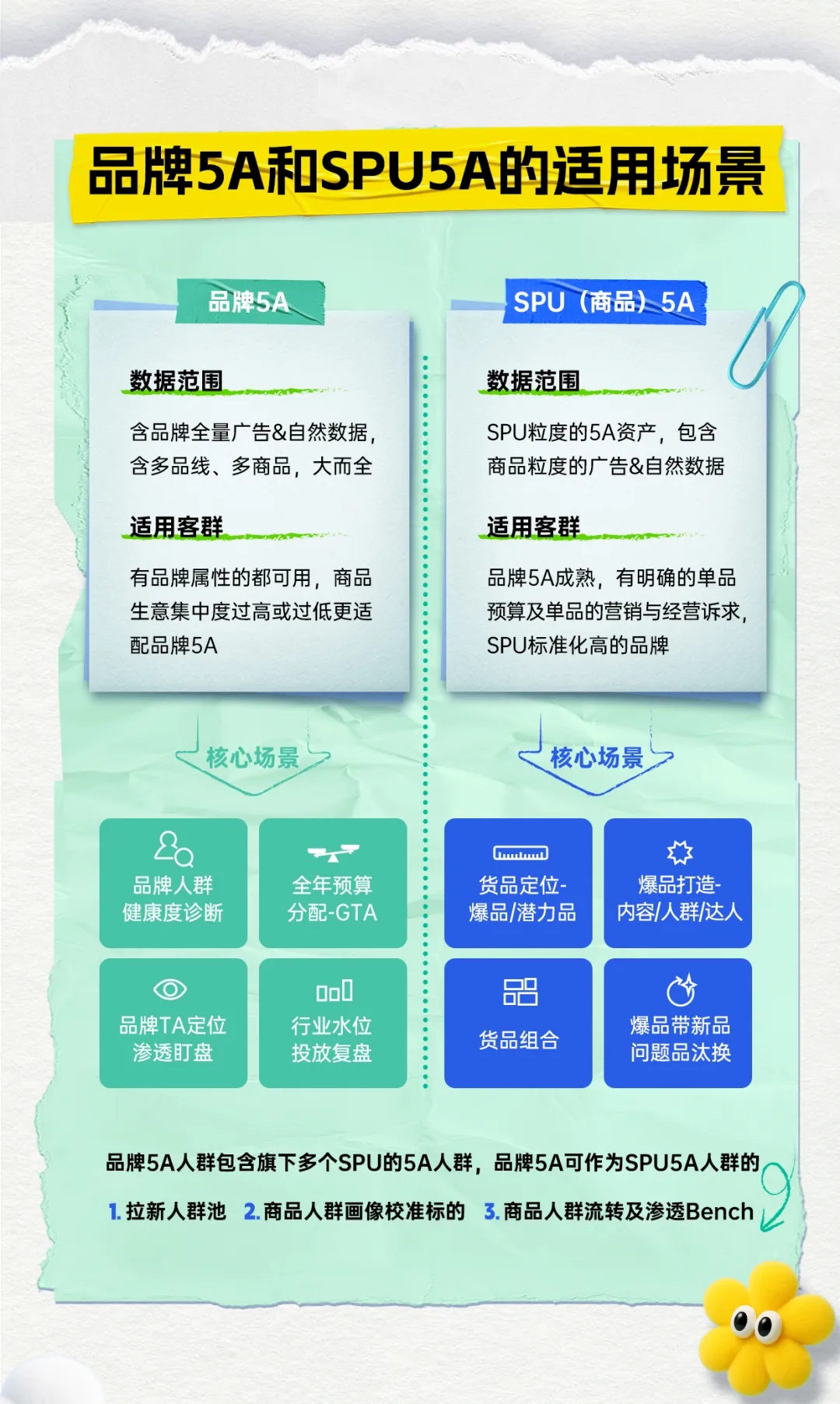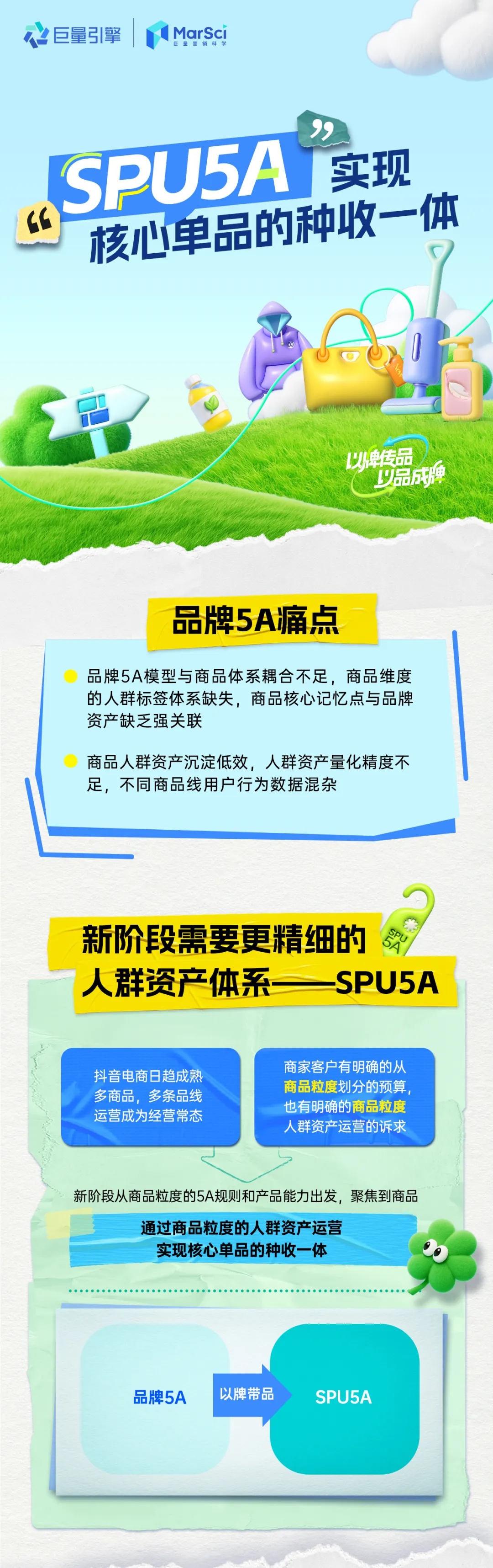 首先,我们先来复习一下什么是SPU5A,SPU5A是巨量云图为商家提供的商品人群资产经营能力支持产品,能帮助商家从商品颗粒度出发,洞察用户行为和行业热点,进而制定营销策略,为品牌沉淀商品人群资产。与品牌人群资产相比,商品人群资产的量化更为精细,聚焦于商品视角,更契合商家多商品、多条产品线运营的需求。SPU5A不仅能带动原有人群资产的转化,还能帮商家撬动更多生意增量。