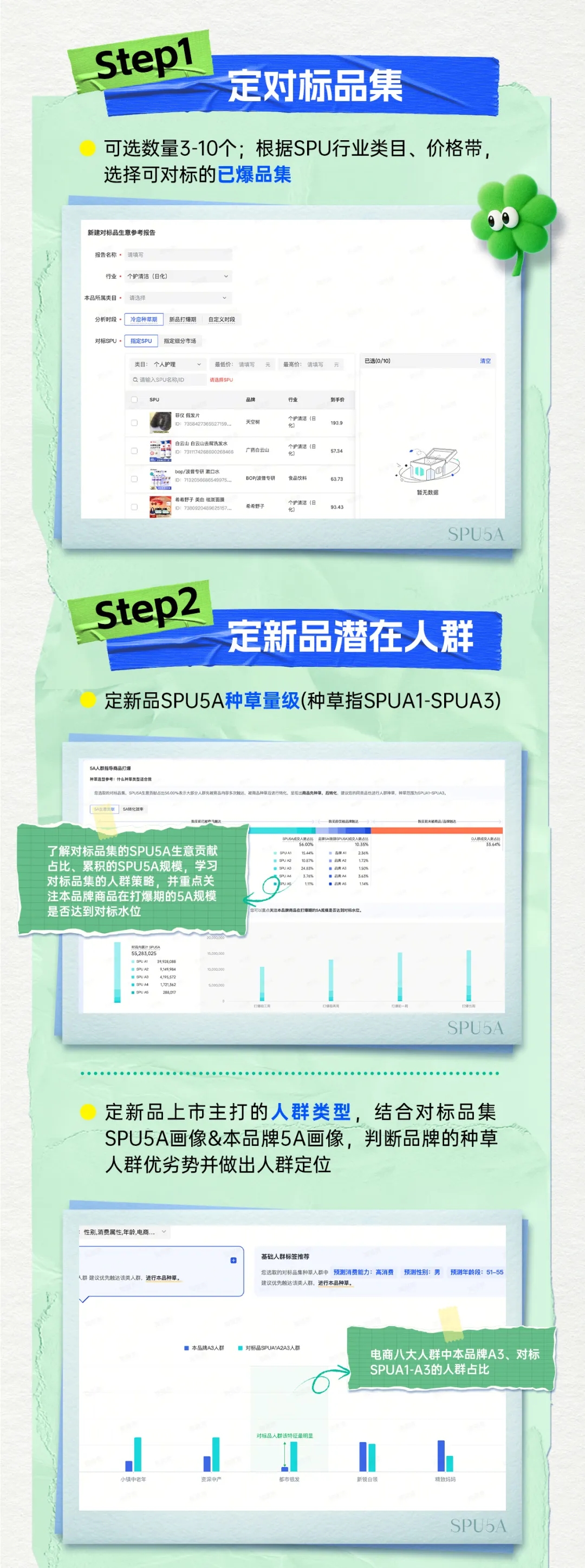 具体而言,SPU5A的新品打爆场景以四大步骤,帮助商家在新品上市前做足营销洞察,有的放矢地制定策略,推动新品爆发。