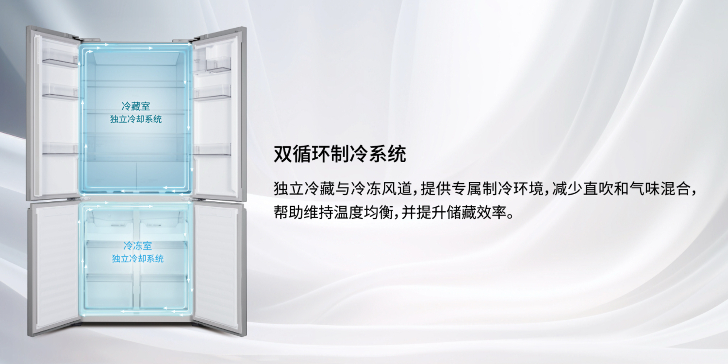 在传统单循环冰箱中,冷藏室与冷冻室共用同一套制冷系统,冷空气在箱体内循环流动,可能存在食材异味交叉、水分流失、细菌滋生等问题长期困扰消费者。冰箱采用双循环制冷系统设计,不仅意味着更高的制冷效率,更在保鲜效果与空间利用上实现了突破。
