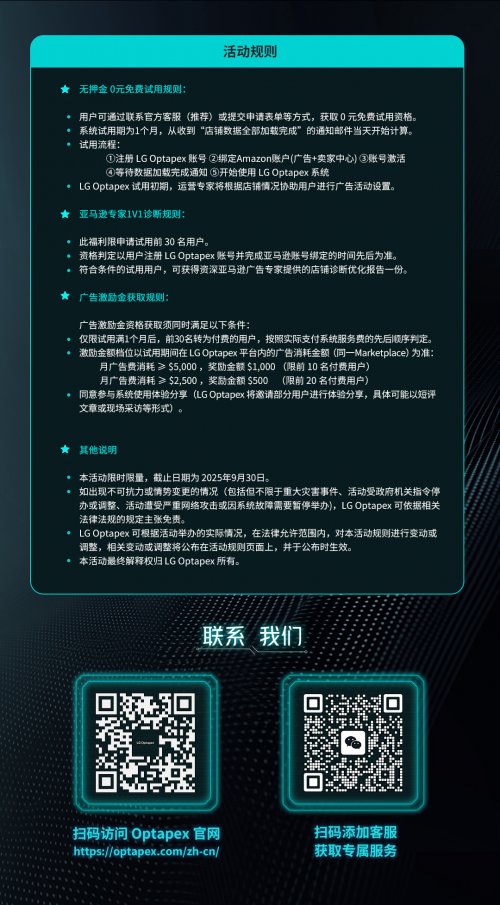 即刻行动,抢占钜惠名额! 注册试用,免费解锁利润洞察,赢取千元美金激励金!让 LG Optapex 的AI力量,为您的亚马逊业务装上“自动利润加速器”!