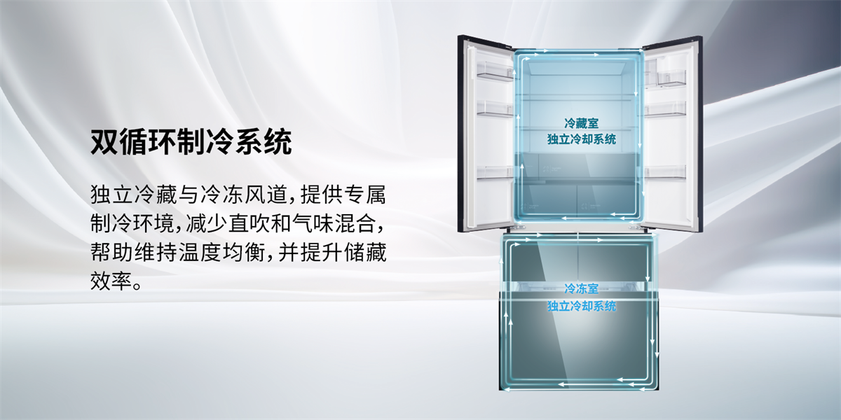 双循环独立制冷系统: 冷藏室与冷冻室拥有独立风道与循环系统,有效避免冷气直吹导致食材脱水、营养流失(如娇嫩的葡萄、草莓等),同时隔绝冷藏与冷冻区域间的串味困扰,确保每一份食材都保留其原汁原味与优质的营养状态。