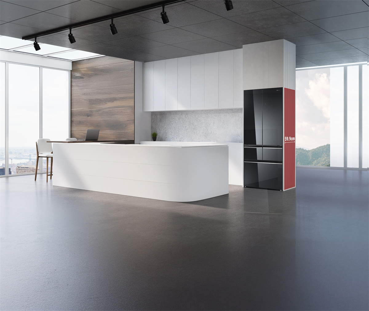 59.9厘米纤薄机身 & 微缝嵌入: 突破传统限制,机身可紧贴墙壁摆放。革新的底部散热技术,仅需两侧各预留0.4厘米微小缝隙。告别冰箱“凸出”的视觉尴尬,实现与橱柜的零距离贴合,打造浑然一体的高端厨房空间。