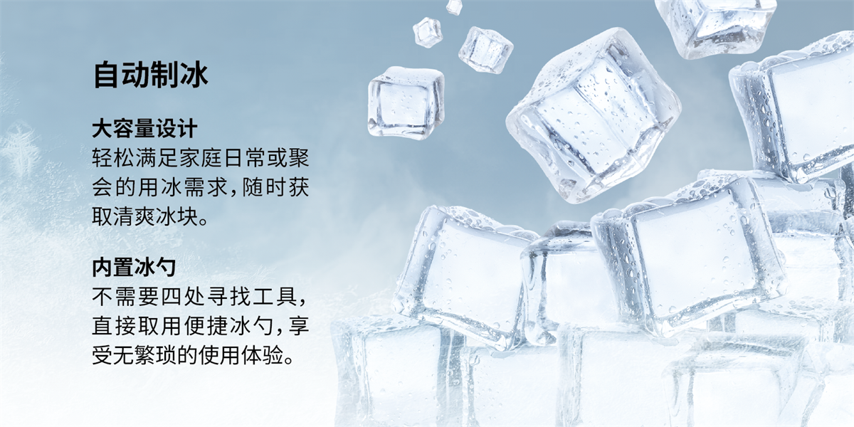 一键洁净制冰: 内置独立制冰系统,连接净水过滤,轻触一键,即可快速产出晶莹剔透、洁净无异味的冰块,畅享清凉时刻。