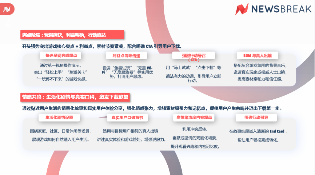 Cecile提到,如今移动游戏已不再是年轻人专属,美国市场有一群银发族正在移动游戏增长中发挥重要作用。他们偏好解谜和闯关挑战类的休闲游戏。制作让用户“看得清、听得懂、信得过”的素材,聚焦爽点,让用户产生情感共鸣更能高效实现用户增长。而NewsBreak作为美国本土领先资讯平台,其用户画像完美覆盖财富自由、房车在手、空闲富裕的银发一族,以自然的原生化广告为广告主获客增长提供了“加速度”。