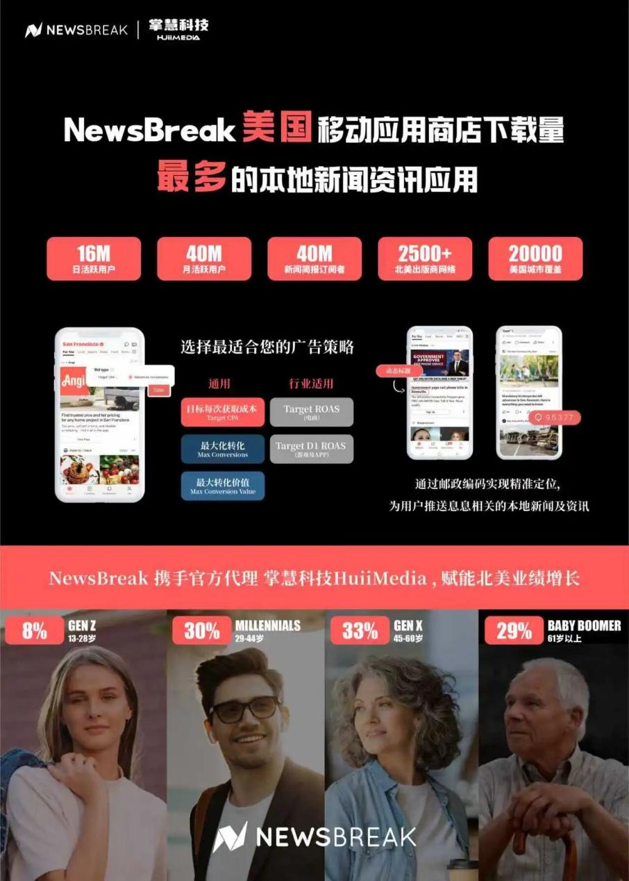 作为美国本地资讯媒体NewsBreak广告官方代理商,掌慧科技HuiiMedia将联合NewsBreak共同亮相本次活动。双方携手共同将为现场行业从业者带来关于北美资讯流广告增长的新思路与新玩法,分享如何借助NewsBreak平台深度触达北美用户,助力跨境品牌高效开拓北美市场。