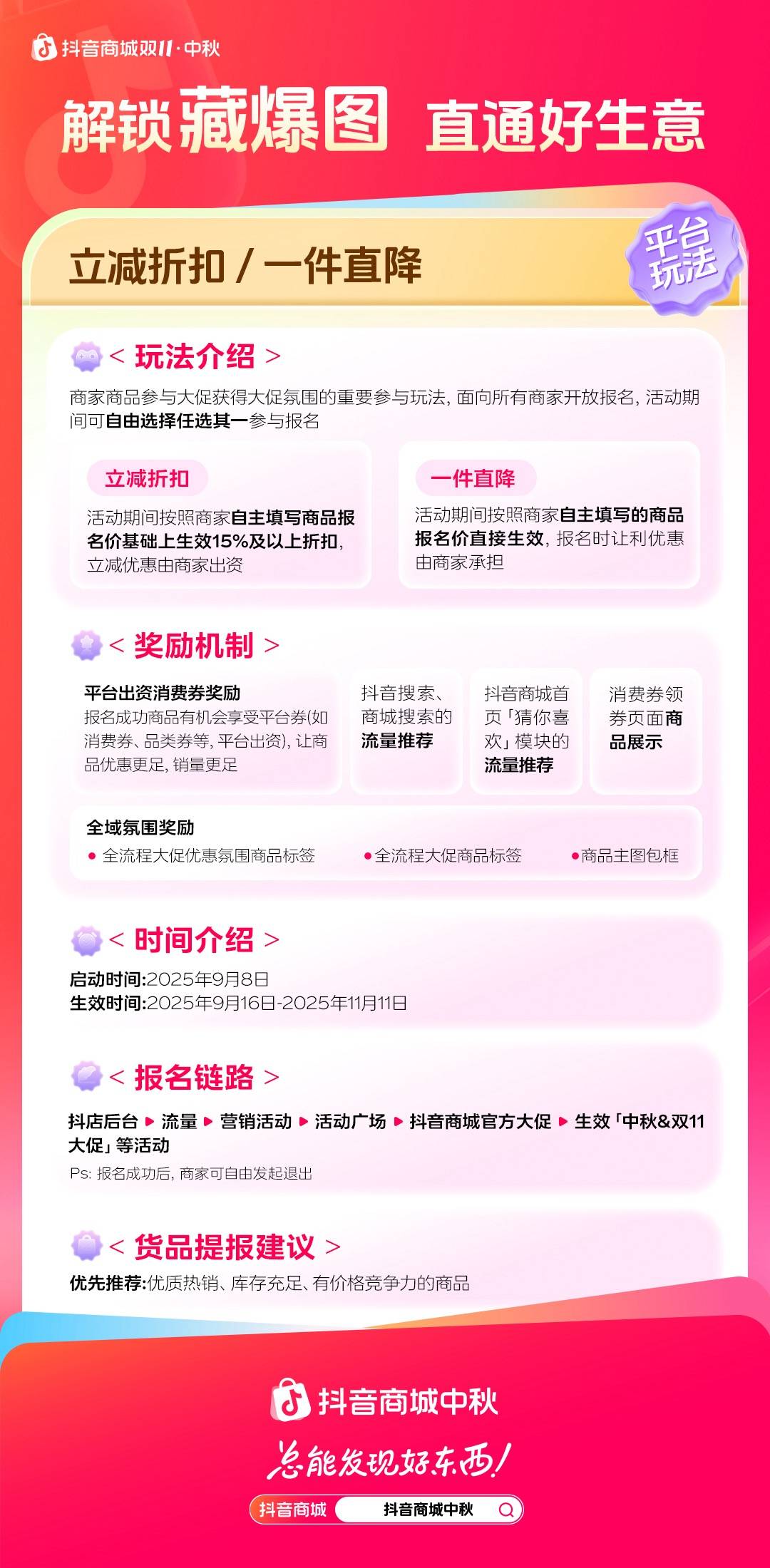 契合消费者注重质价比、追求简单省心的消费需求,本次中秋大促,延续「立减折扣/一件直降」玩法,简洁明了的平台折扣与让利机制,让消费者更直接感知优惠力度,帮助商家快速营造大促氛围,助推中秋全品热卖。同时,报名成功的商品有机会获得抖音商城中秋消费券(简称消费券)扶持。消费券由平台出资,覆盖抖音商城中秋和双11大促全周期,可在单品立减的基础上叠加使用。本次消费券投入力度空前,发放周期更长、渠道触达更广、覆盖用户的规模更大。