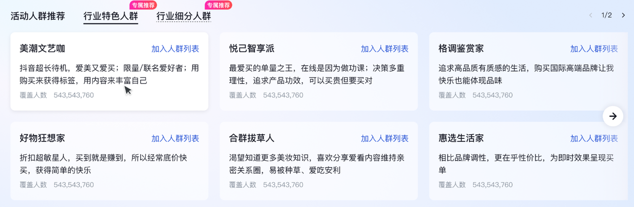 在本次「618大促作战室」,巨量云图全新升级“行业特色人群”和“行业细分人群”两大人群包,为品牌提供垂直领域细分人群洞察,帮助品牌进行精细化人群运营,提升大促期间抢夺高潜客群的能力。