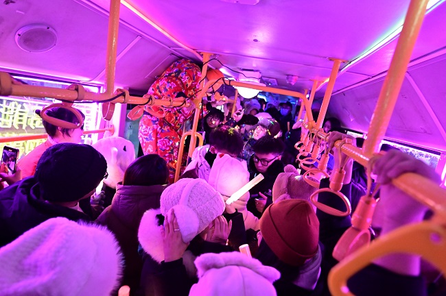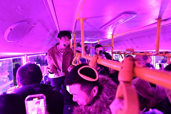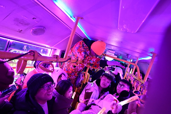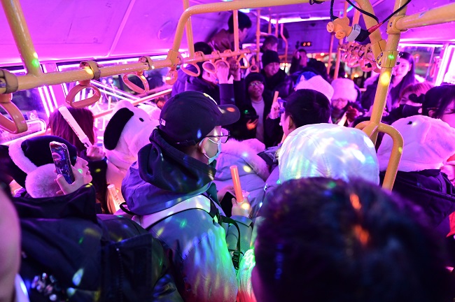 随着车辆一路前行,坐在车上的每一个人,无论是南方来的小土豆还是对于蹦迪公交早就游刃有余的本地人,都在这支洗脑神曲的伴奏下,体验着一种独特的快乐。他们在这个特别的夜晚,把烦恼和寒冷甩掉,一起释放自己的情绪。