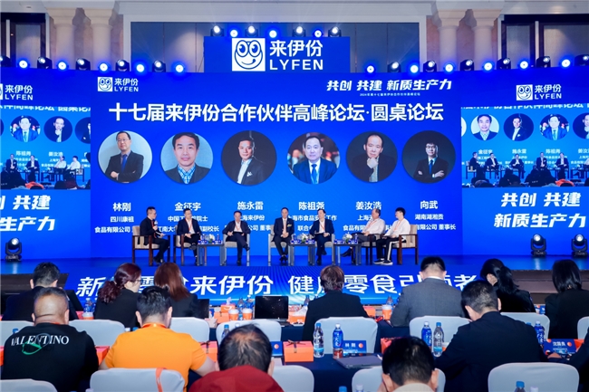 圆桌论坛环节,金征宇教授、施永雷董事长与同样来自这个行业的资深食品人,同时也作为来伊份的优秀供应商代表,共同探讨新质生产力在休闲食品这个相对传统的领域里面如何来实现。