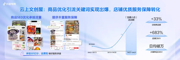 「宝藏小店」以场景化内容为纽带,让不同圈层人群一步到位找到心仪小店、心动好物。同时,中小商家在IP助力下,不断放大自身品类特色、产品特色,拉近与用户的情感距离,进而促进商业转化。在这个过程中,抖音电商给商家提供三方面加成,加速爆单。