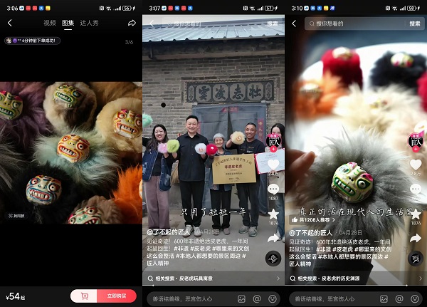 @了不起的匠人 走进中国泥塑之乡河南浚县,找到了一直从事泥塑制作的技艺传承人——今年已经77岁的王居梅奶奶,并用镜头记录下了她与泥塑的故事。泥塑手艺与河南土地所蕴藏的文化故事,在一条条短视频中交织呈现,也成功产出了几条小爆款视频,累计视频播放量超90万。短视频流量的爆发也带来了生意的爆发,曾经“没人要”的皮老虎,开售当天就达成了过去三年的订单量总和,店铺GMV增长275%。