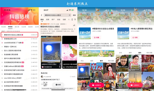 优质内容带来高质量互动,带动热点话题产生,催生二创等更多内容爆发、反哺好生意持续滚动。为激发文创品生意活力,平台结合地方文旅特色策划相关活动,联动38家文旅账号内容共创,覆盖商品数多达 52.5万。在平台、商家、用户的积极参与下,形成#哪里来的文创这么会整活、#本地人都想要的景区周边等多个高质量热点,话题最高登种草榜TOP 1、累计看后搜曝光量28.6万的好成绩,在五一假期不断掀起文创热。