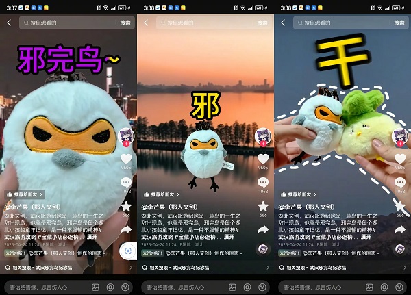 @李芒果(鄂人文创)从武汉街头巷尾的烟火气中捕捉灵感,将一句地道的方言俚语"邪完鸟"(意为"太调皮了")幻化成憨态可掬的文创玩偶。这款极具网感的"邪完鸟"玩偶,通过可爱的外形设计和魔性的方言配音,精准戳中了年轻人的萌点。借助热点话题#哪里来的文创这么会整活,"邪完鸟"的魅力以及武汉方言文化被快速传播,火爆出圈。