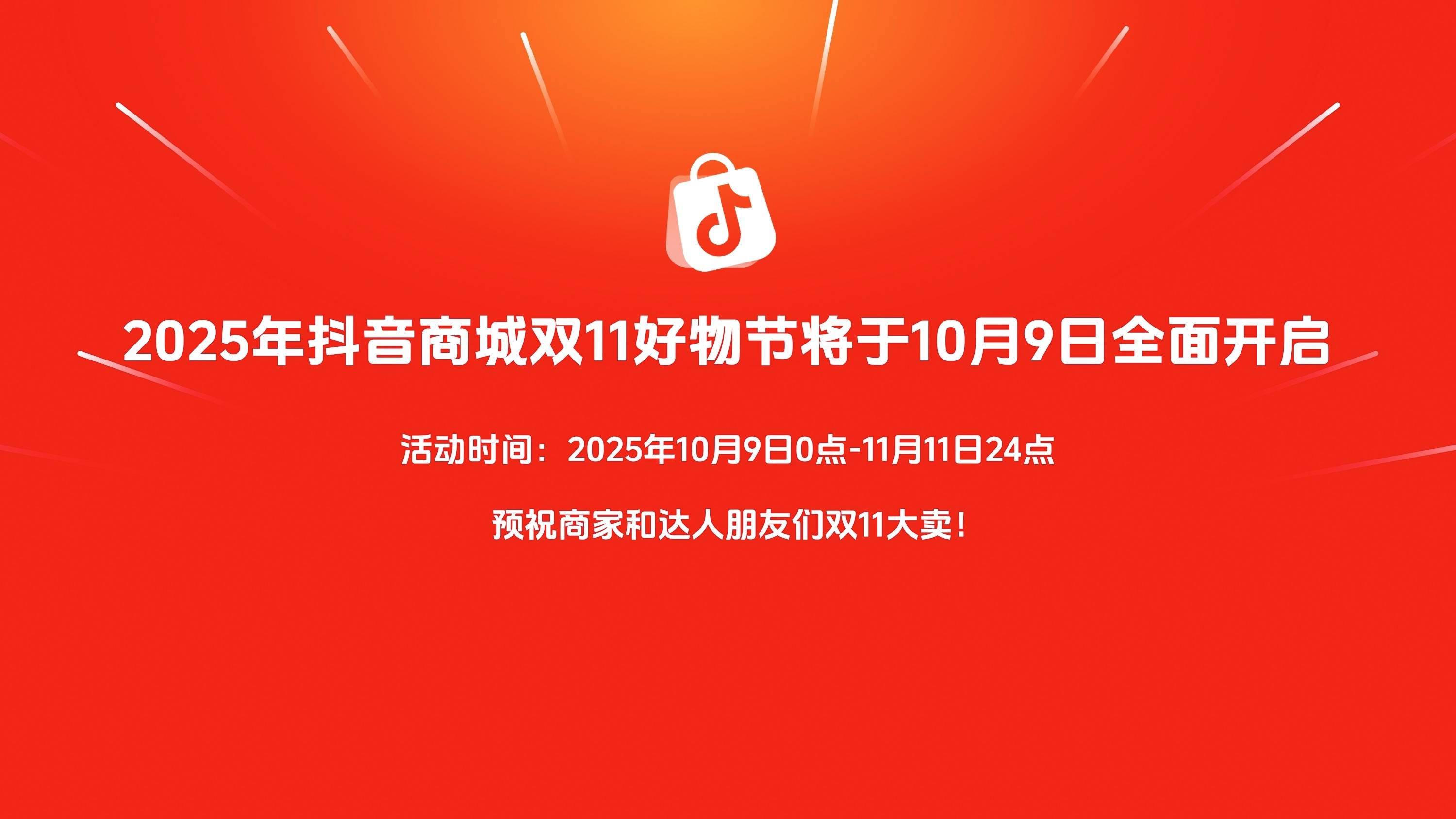 紧随中秋大促火热势头,「2025年抖音商城双11好物节」将于10月9日0:00全面开启!期待更多商家、达人紧跟平台节奏,提前布局双11大促,锁定全年重要消费窗口,实现生意与品牌的双向放大。