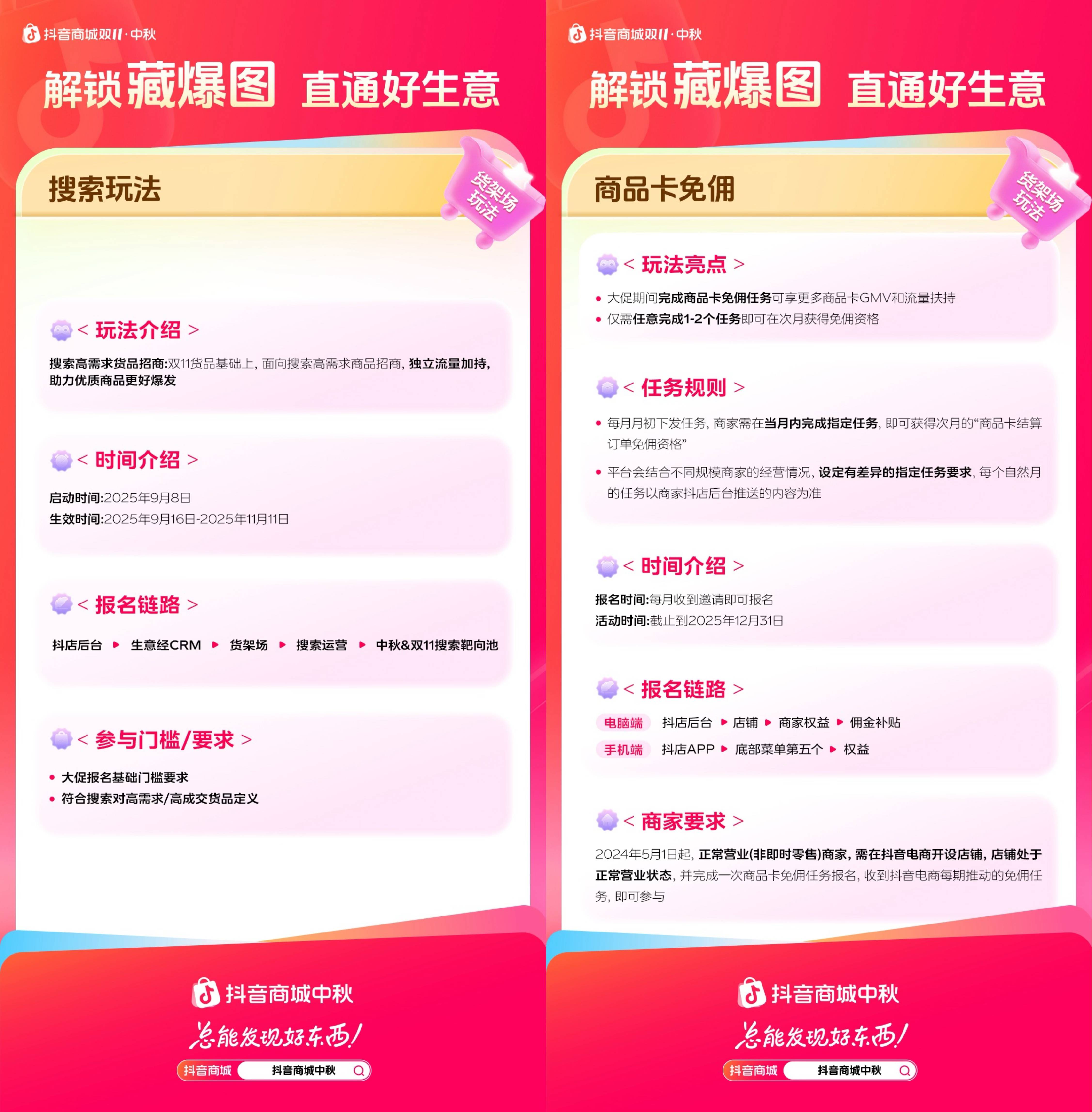 中秋大促已燃爆全场,优质商品、头部达人和活跃商家纷纷实现销量突破,平台各类玩法全面发力,带动生意高效转化。正值热度延续期,商家可借势中秋销售势头,积极参与抖音商城大促玩法,持续获取流量扶持与曝光资源,预定双11全周期增量。