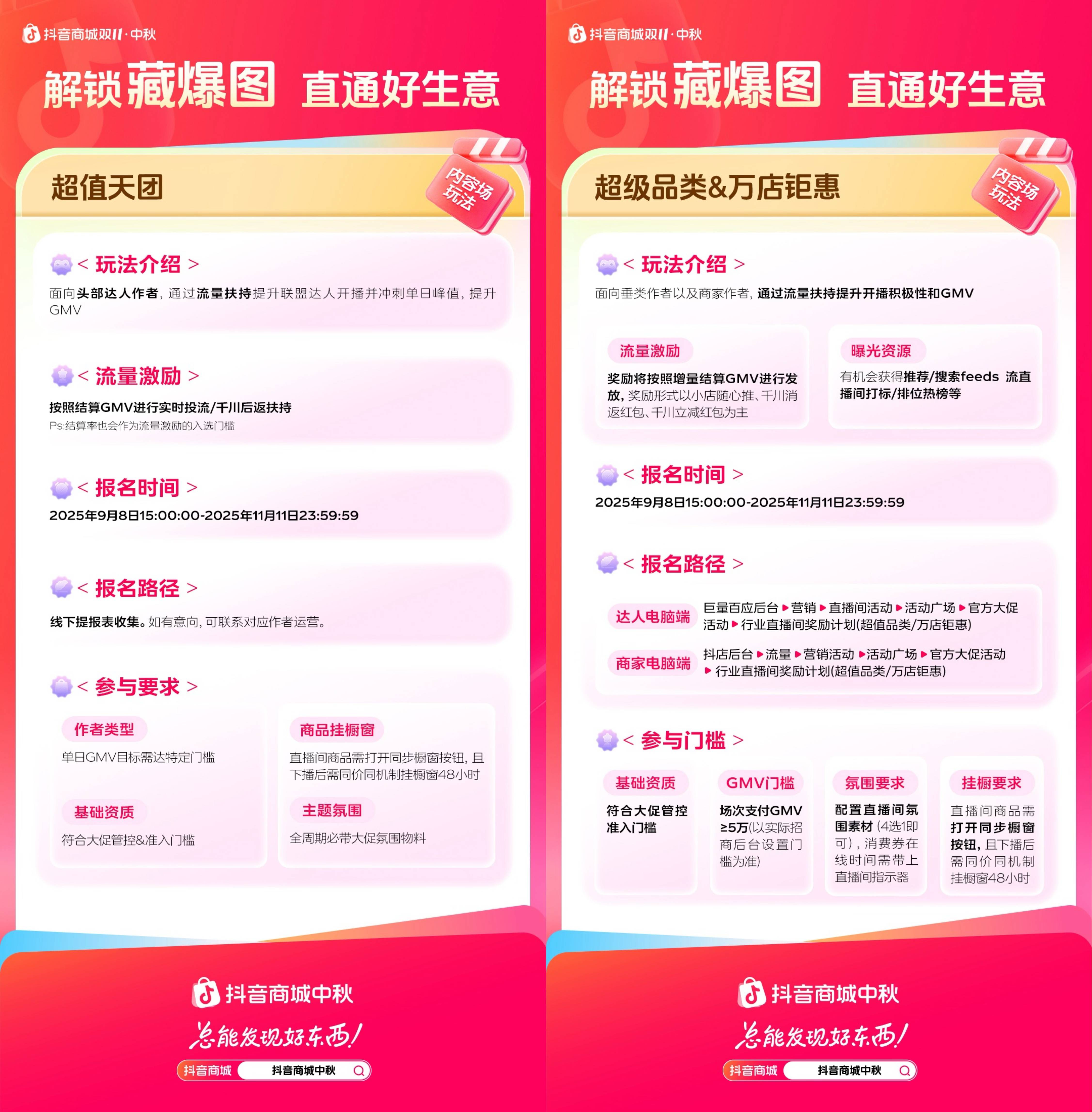 内容场玩法方面,「超值天团」成为头部达人冲刺单日GMV大爆的利器,平台会为头部联盟达人作者提供足量流量扶持,为其大场直播 “再添一把火”,助力达人突破单日 GMV 峰值。「超级品类&万店钜惠」则面向垂类达人和商家作者,通过流量与曝光的双重激励,形成“多播多奖”的正向循环:开播表现越好、GMV增长越快,获得的流量资源就越丰厚。同时,垂类达人和商家还有机会获得平台多样曝光资源加持,持续为直播间引入新老客群,加速生意转化。