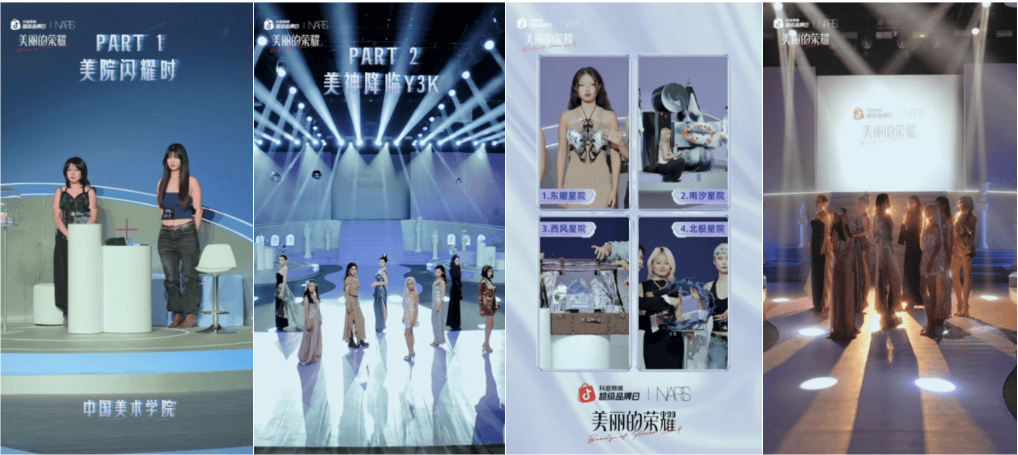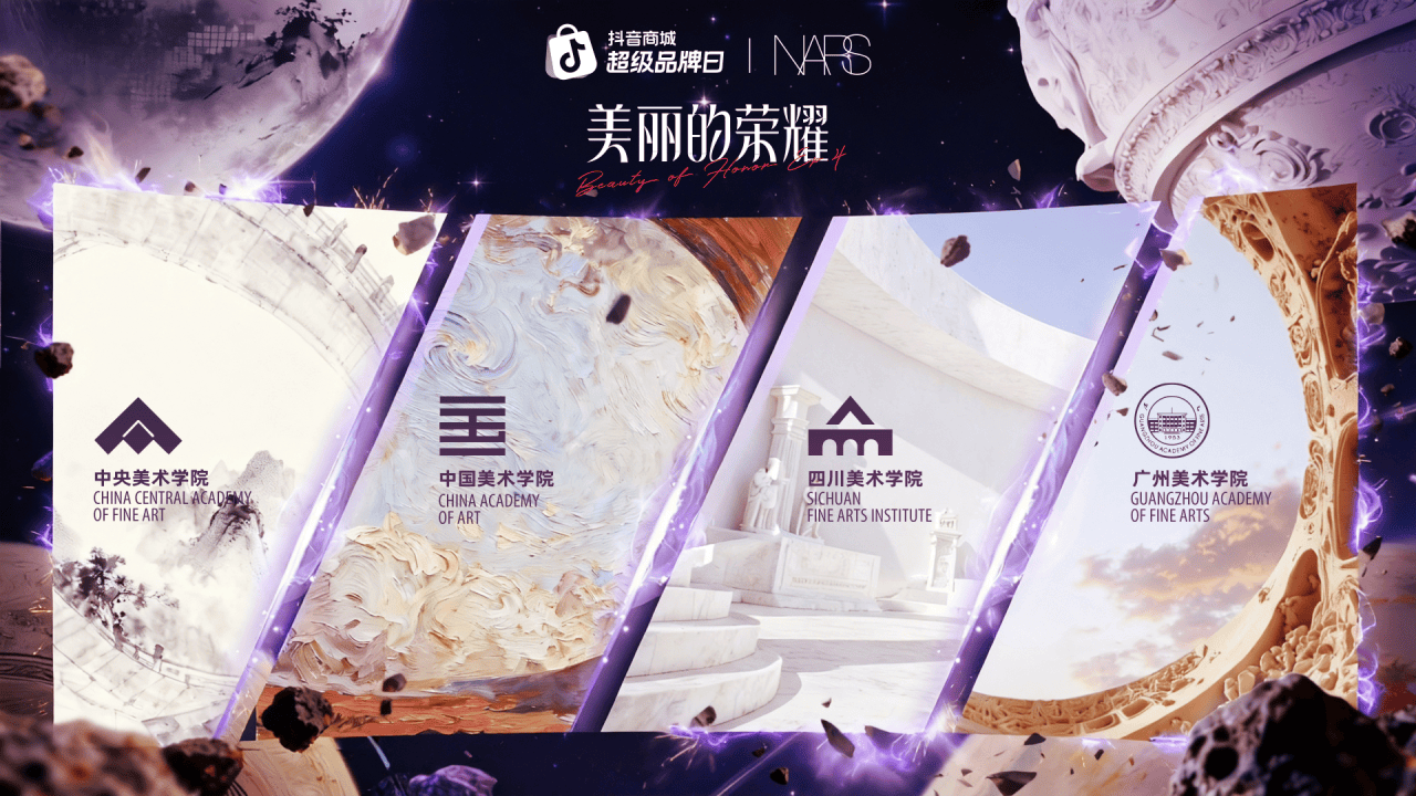 以彩妆品牌NARS为例,今年双11前夕,NARS联手抖音电商的头部内容IP「美丽的荣耀」,将自己的品牌活动搬到了抖音直播间,让来自中国四大美院的学生用NARS的月光大白饼等明星单品,创造出许多充满未来感的流光妆容。对于用户来说,这更像是一场大胆前卫、跨界创新的艺术妆容创作大赛,可以更具象地感受到其中先锋、多元和前卫的精神内核。