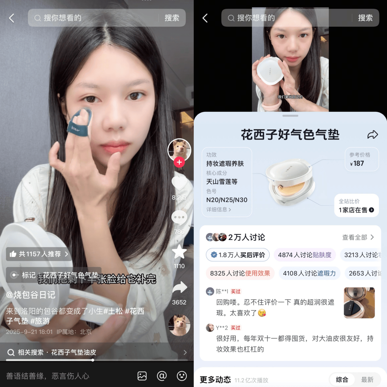 以第一阶段上榜品牌花西子和谷雨为例,他们都通过「标记万物」,借助「轻手段」强化用户心智,进而获得成交爆发。抖音创作者@烧包谷日记 在自己的洛阳旅行vlog中,在景区妆造排队时自然使用花西子气垫,突出产品在粉质、遮瑕力和持妆力上的优点。这条vlog视频有超过142万观看,通过自然且轻巧的露出,品牌被场景化种草,用户看后开始搜索相关产品,也随之拉动了成交。