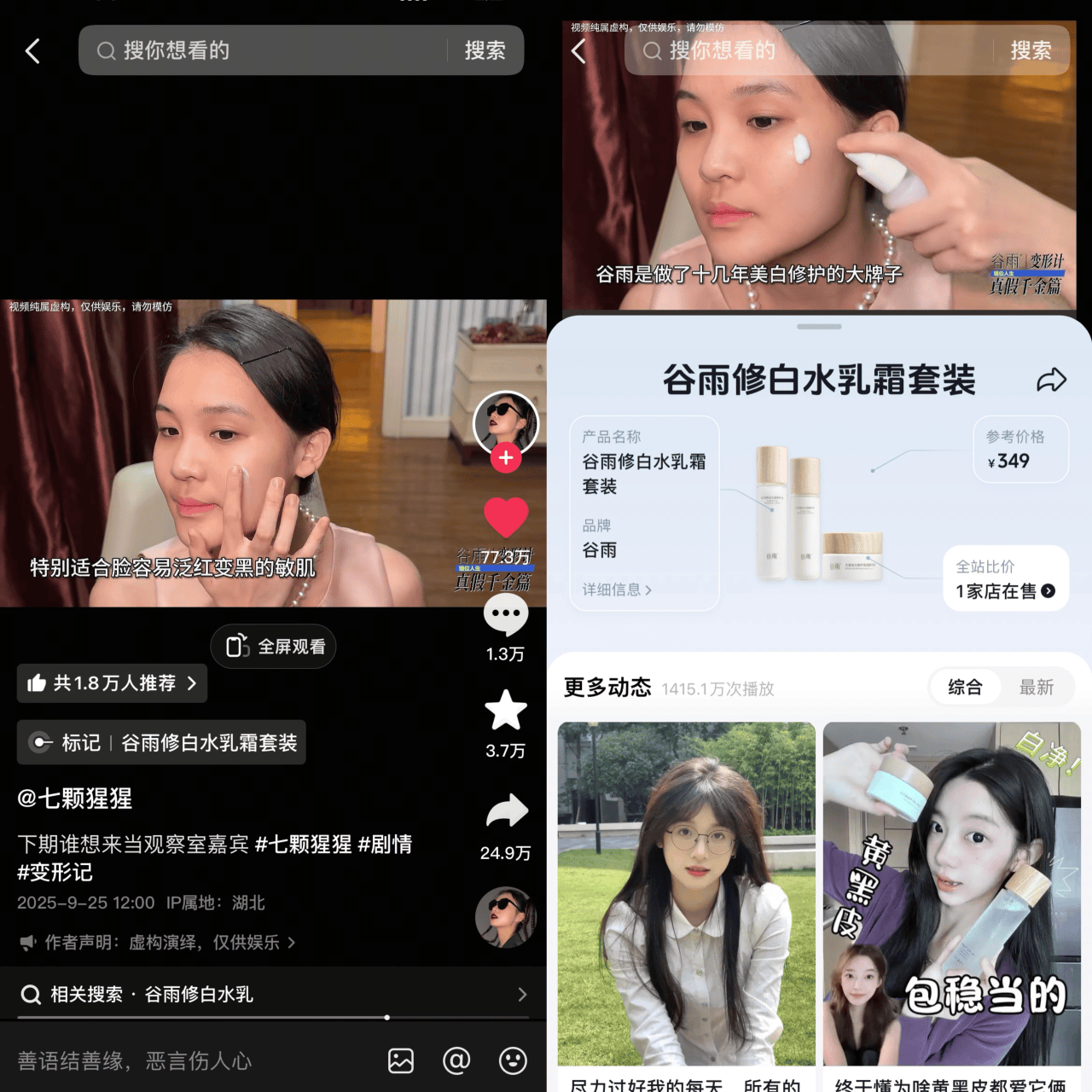 谷雨则在抖音创作者@七颗猩猩 的一条千万观看量视频中被「标记」。@七颗猩猩 借用「真假千金」做话题演绎,借由剧情中的肌肤敏感冲突,将谷雨套装优势自然带出,为谷雨带来了近5万次看后搜。