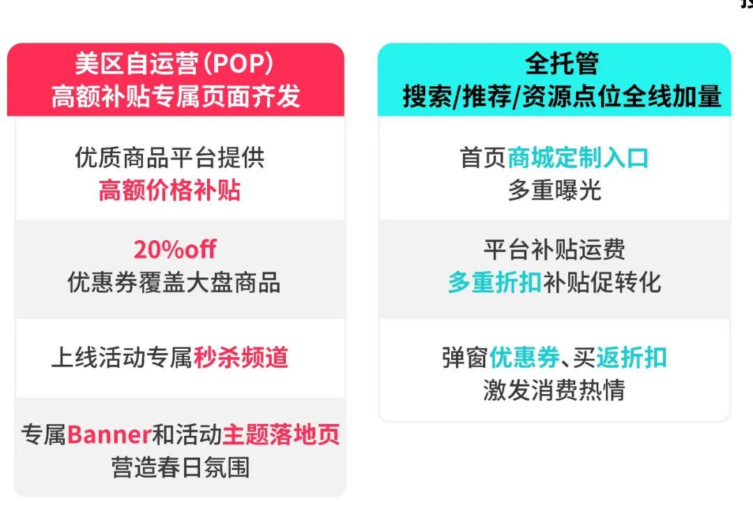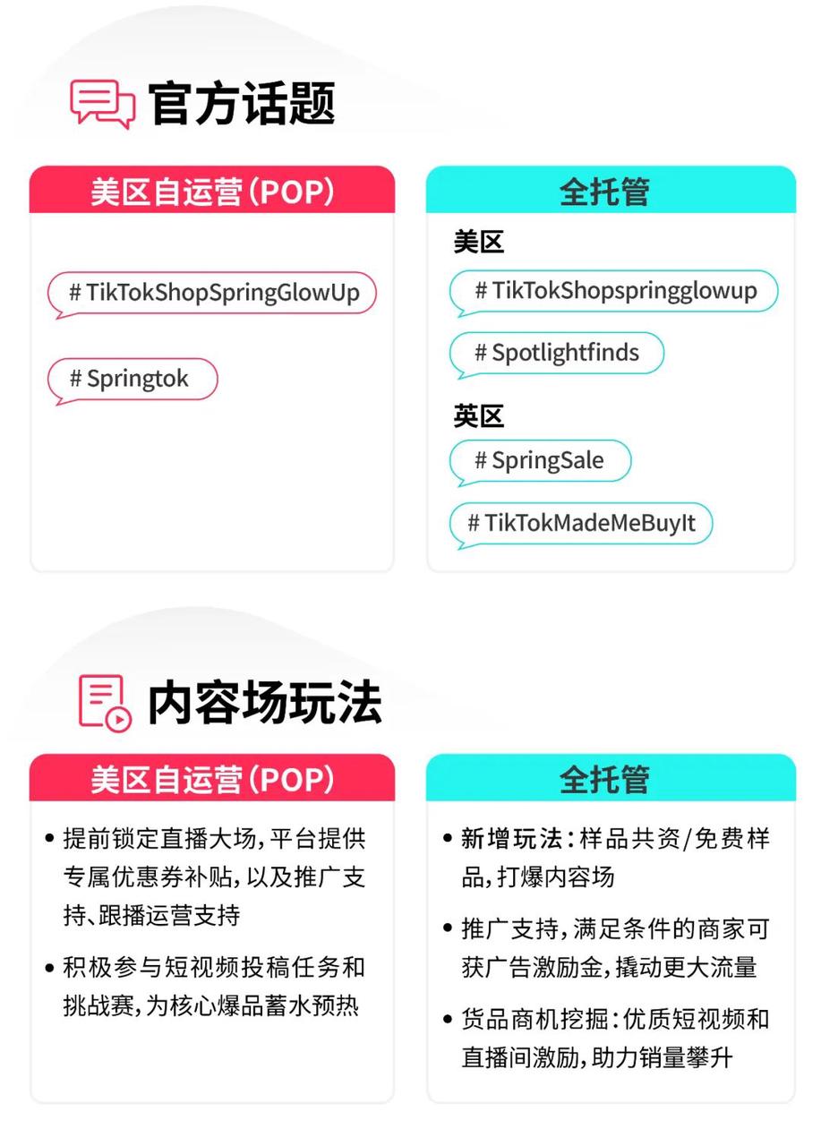 在本次春季大促期间,TikTok Shop针对美区自运营(POP)商家、全托管商家推出了丰富玩法,通过提供商品补贴、内容玩法、商城频道曝光等,助力商家春促大卖。
